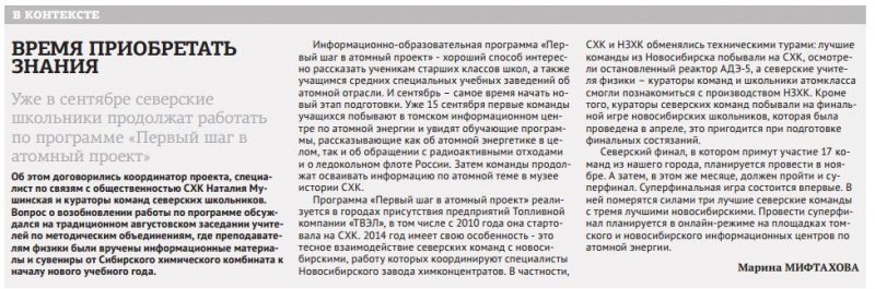 Статья вышла в еженедельной городской газете ОАО «СХК»