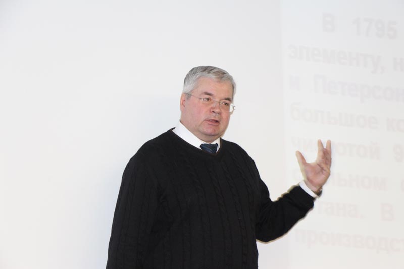 С докладом выступил профессор кафедры технологии редких, рассеянных и радиоактивных элементов ТПУ Владимир Карелин, который рассказал слушателям о свойствах титана и его соединений, истории открытия титана, о технологических процессах его получения и перспективах использования.