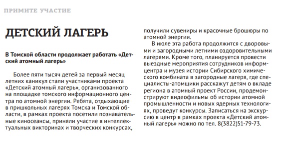 В июле эта работа продолжится с дворовыми и загородными летними оздоровительными лагерями. Кроме того, планируется провести выездные мероприятия сотрудников информцентра и музея истории Сибирского химического комбината в загородные лагеря, где специалисты-атомщики расскажут детям о вкладе региона в атомный проект России, продемонстрируют видеофильмы об истории атомной промышленности и новых ядерных технологиях, проведут конкурсы. Записаться на экскурсию в центр в рамках проекта «Детский атомный лагерь» можно по тел. 8(3822)51-79-73.