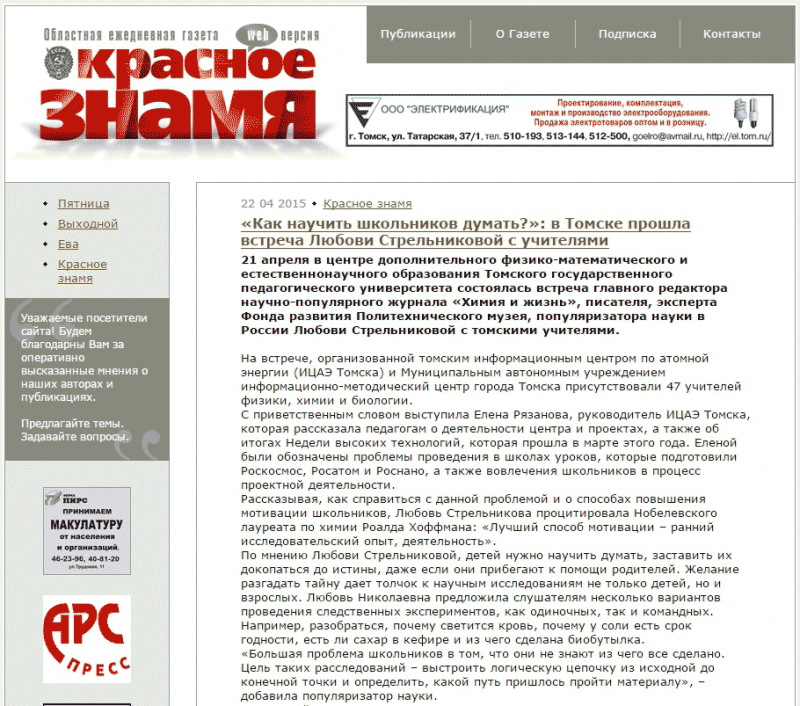 21 апреля в центре дополнительного физико-математического и естественнонаучного образования Томского государственного педагогического университета состоялась встреча главного редактора научно-популярного журнала «Химия и жизнь», писателя, эксперта Фонда развития Политехнического музея, популяризатора науки в России Любови Стрельниковой с томскими учителями.