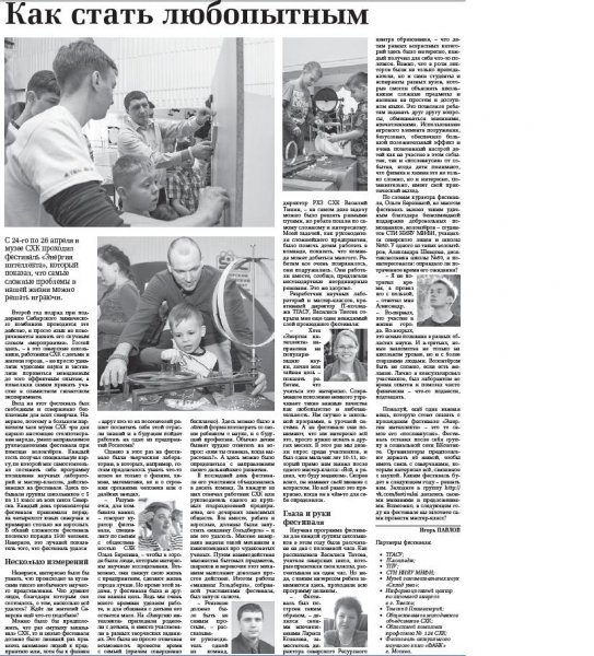Второй год подряд при поддержке Сибирского химического комбината проводится это действо, и просто язык не поворачивается назвать его скучным словом «мероприятие». Гостей здесь, — а это северские школьники, работники СХК с детьми и жители города, — не просто удивляли чудесами науки и заставляли поразиться невиданным до того эффектным опытам, а позволили самим принять участие в совместном гигантском эксперименте.