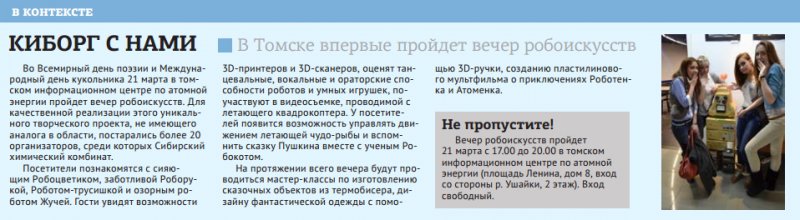 Статья вышла в еженедельники «Новое время» (ЗАТО Северск) 21 марта, № 12, стр. 6