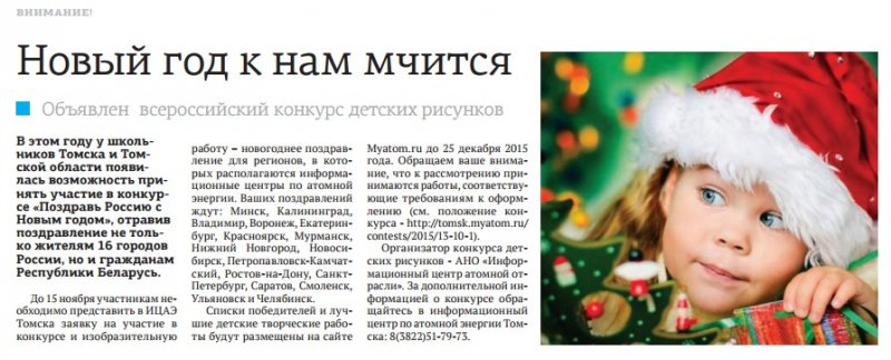 До 15 ноября участникам необходимо представить в ИЦАЭ Томска заявку на участие в конкурсе и изобразительную работу — новогоднее поздравление для регионов, в которых располагаются информационные центры по атомной энергии. Ваших поздравлений ждут: Минск, Калининград, Владимир, Воронеж, Екатеринбург, Красноярск, Мурманск, Нижний Новгород, Новосибирск, Петропавловск-Камчатский, Ростов-на-Дону, Санкт- Петербург, Саратов, Смоленск, Ульяновск и Челябинск.