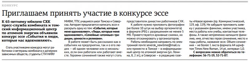 Статья вышла в еженедельной городской газете ОАО «СХК»