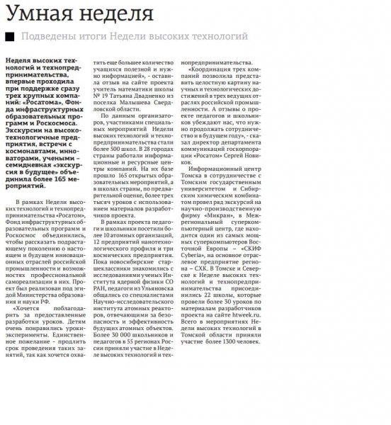 В рамках проекта педагоги и школьники посетили более 10 атомных организаций, 12 предприятий нанотехнологического профиля и три космических предприятия. Пока новосибирские старшеклассники знакомились с исследованиями ученых Института ядерной физики СО РАН, педагоги из Ульяновска общались со специалистами Научно-исследовательского института атомных реакторов, отвечающими за безопасность и эффективность будущих атомных объектов. Более 30 000 школьников и педагогов в 55 регионах России приняли участие в Неделе высоких технологий и технопредпринимательства.