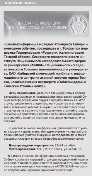 «Школа-конференция молодых атомщиков Сибири — ежегодное событие, проходящее в г. Томске при поддержке Госкорпорации „Росатом“, Администрации Томской области, Северского технологического института Национального исследовательского ядерного университета „МИФИ“, Национального исследовательского Томского политехнического университета, ОАО „Сибирский химический комбинат“, информационного центра по атомной энергии города Томска, некоммерческих партнерств „Сибатомкадры“ и „Томский атомный центр“».